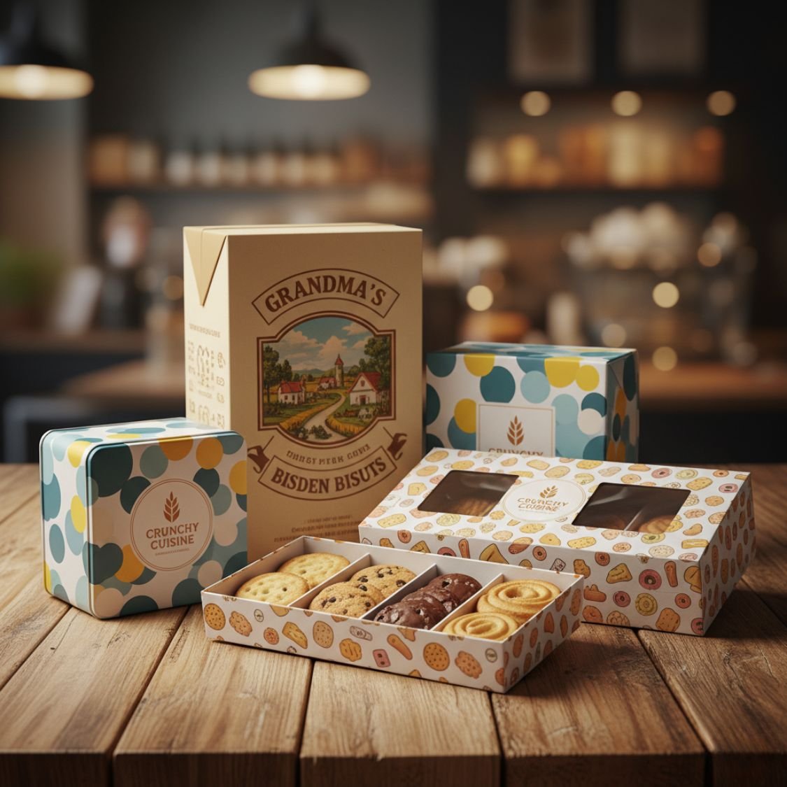 Choose from multiple designs — window boxes, tuck-end boxes, sleeve boxes, or custom shapes. Our biscuit boxes can be tailored to fit your product quantity and design needs, ensuring functionality and elegance for every order.